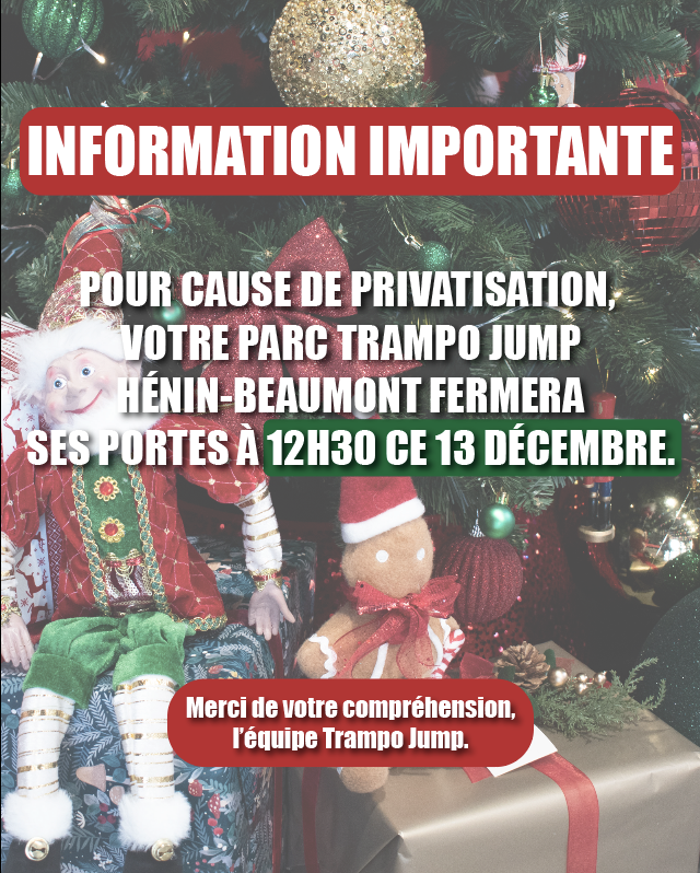 L’utilisation des trampolines de TRAMPO JUMP implique des risques (de blessures) qui ne peuvent pas être exclus sans affecter l’activité. En signant la présente déclaration, vous reconnaissez que les activités organisées par TRAMPO JUMP (sauter sur des trampolines, sauter dans la fosse, utiliser le parcours ninja, le wipe out, le twister ou encore le basket ball) peuvent occasionner des blessures.